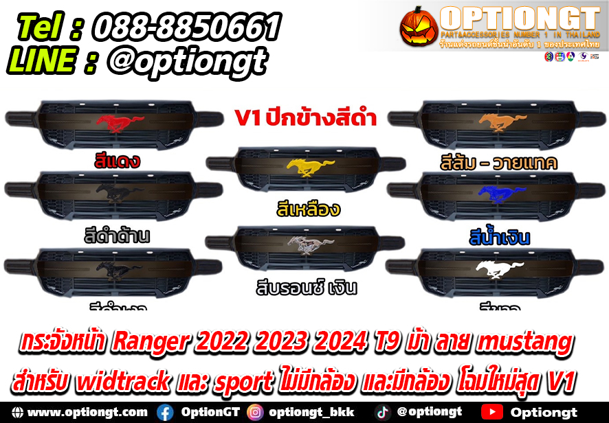 - กระจังหน้า Ranger 2022 2023 2024 T9 ม้า ลาย mustang สำหรับ widtrack และ sport ไม่มีกล้อง และมีกล้อง โฉมใหม่สุด