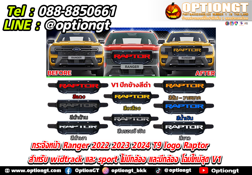 - กระจังหน้า Ranger 2022 2023 2024 T9 logo Raptor สำหรับ widtrack และ sport ไม่มีกล้อง และมีกล้อง โฉมใหม่สุด